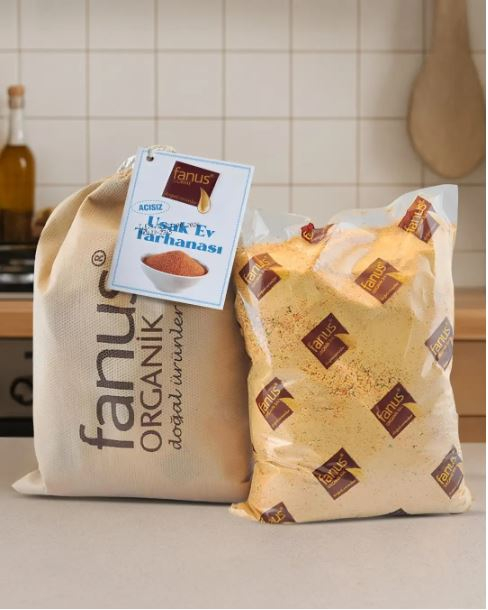 Fanus Uşak Ev Ev Yapımı Tarhana domates,yeşil ve kırmızı kapya biber, soğan, süzme yoğurt, yaş ve kuru nane, tam buğday ununun fermantasyonuyla üretilmektedir.
